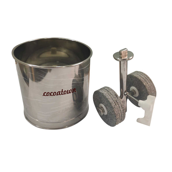 Cet ensemble de mini tambours et de pierres à rouleaux est idéal pour les clients qui souhaitent tester des micro-lots de chocolat dans un lot pour tester des recettes. Cet ensemble de tambour et de pierre à rouleaux peut moudre 500 g – 1 kg (1 à 2 lb) de grué de cacao. De plus, les pierres à rouleaux sont cylindriques pour imiter le broyeur ECGC-65E , la mise à l'échelle est donc beaucoup plus facile.