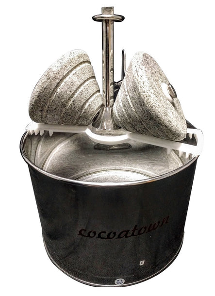 Chococleaner is an accessory for CocoaTown ECGC-12SLTA, ECGC-12SLECGC-12SQSS or Abi10 melangers. Chococleaners help to remove the chocolate liquor stuck to the roller stones – saves chocolate, cleaning time and energy. Once the grinding is done, remove the drum assembly from the melanger. Remove the roller stones with chocolate from the drum.  Place the chococleaner on top of the drum. Then place the roller stone assembly on top of the chococleaner. Rotate the roller stones and all the chocolate liquor drips into the stainless steel vessel.  Clean the sides of the roller stones using a spatula.